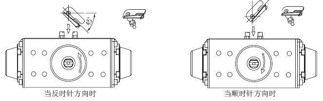 3,把執(zhí)行機構(gòu)軸的回轉(zhuǎn)位置對準起始位置,即開度的0%位置。當執(zhí)行機構(gòu)是利用彈簧的單作用氣缸時,如果不輸入氣源壓力,則氣缸軸始終返回到起始點,因此很容易確認。當雙作用氣缸時,請參照氣缸說明書,確認是順時針旋轉(zhuǎn)還是逆時針旋轉(zhuǎn),或輸入空壓時氣缸軸的回轉(zhuǎn)方向來判斷。