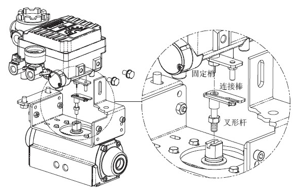 4,設(shè)定好叉形桿后,順時針方向擰緊叉形桿下面的固定螺絲。把閥門定位器安裝在支架上。閥門定位器放置在支架上方時,主軸下面的固定梢對準叉形桿上方的中心孔內(nèi),同時把主軸反饋桿上的連接棒插入到叉形桿的插槽。這是為了讓閥門定位器的主軸和氣缸軸的中心一致,如果中心沒有對準,那么閥門定位器的主軸上產(chǎn)生負荷力,影響產(chǎn)品的內(nèi)構(gòu)成,因此請正確對準中心。